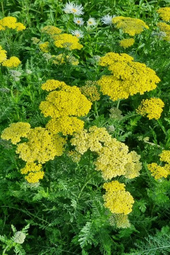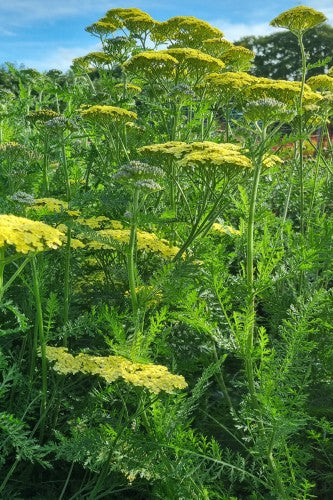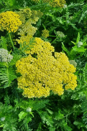 Flat yellow flower heads that age to cream above feathery greyish-green foliage.